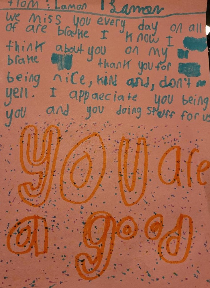 When the first kiddo saw me, his face lit up; he ran towards me at full speed and jumped in my arms! That reaction continued throughout the day. They acted as if I’d been gone for weeks. They told me about how different it was without me there; one even compared it to a funeral. Then after snack, our director asked me to sit down, which was an odd request. And once I sat down, my babies came up, one by one, with handwritten cards, letters, and hugs!
